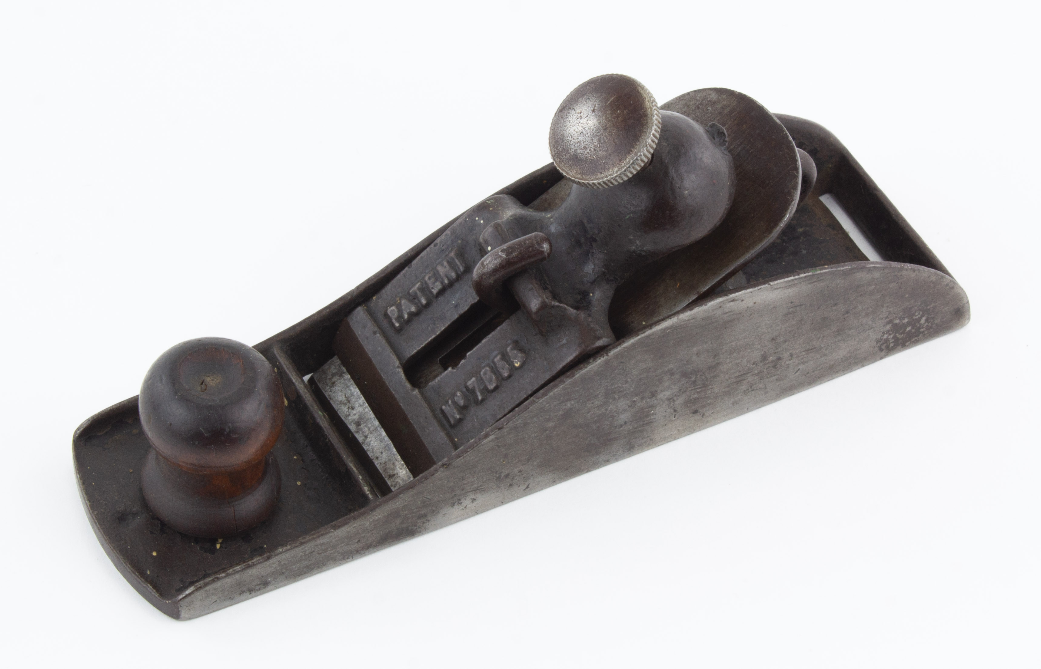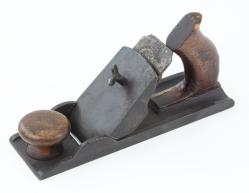 B68-749 REVERSIBLE BLOCK PLANE. Thropp Patent. Similar to a Stanley No. 130 where the cutter can be reversed to serve as either a block or bullnose. 7-3/8" sole and 1-5/8" unmarked cutter marked. The lever cap is hooked onto a metal hook cast into the bed. It has "Patent 7855" cast into the lever cap, which was issued to John Thropp of Sheffield, and most examples were made by Wingfield & Rowbotham, a firm founded in 1751 and better known for its edge tools and cutlery. Japanning 90% and metal clean. Good 75-150
