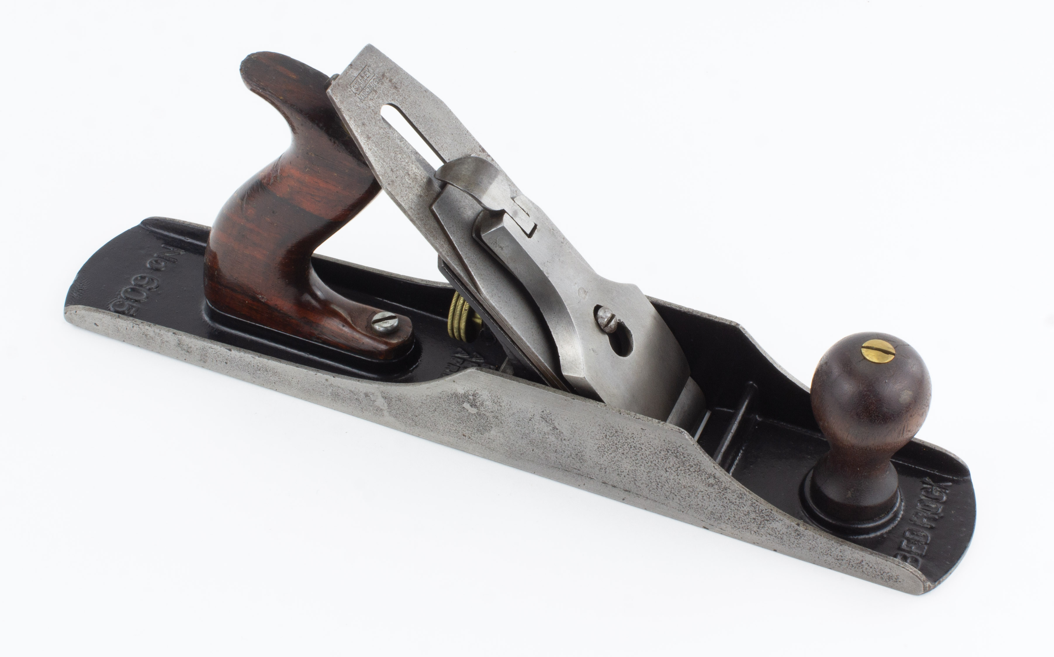 B68-750 BEDROCK JACK PLANE. Stanley No. 605C. Type 10 but with unmarked lever cap and notched rectangle cutter. Wood near fine, japanning complete, light pitting on both cheeks and sole. Good+ 100-200