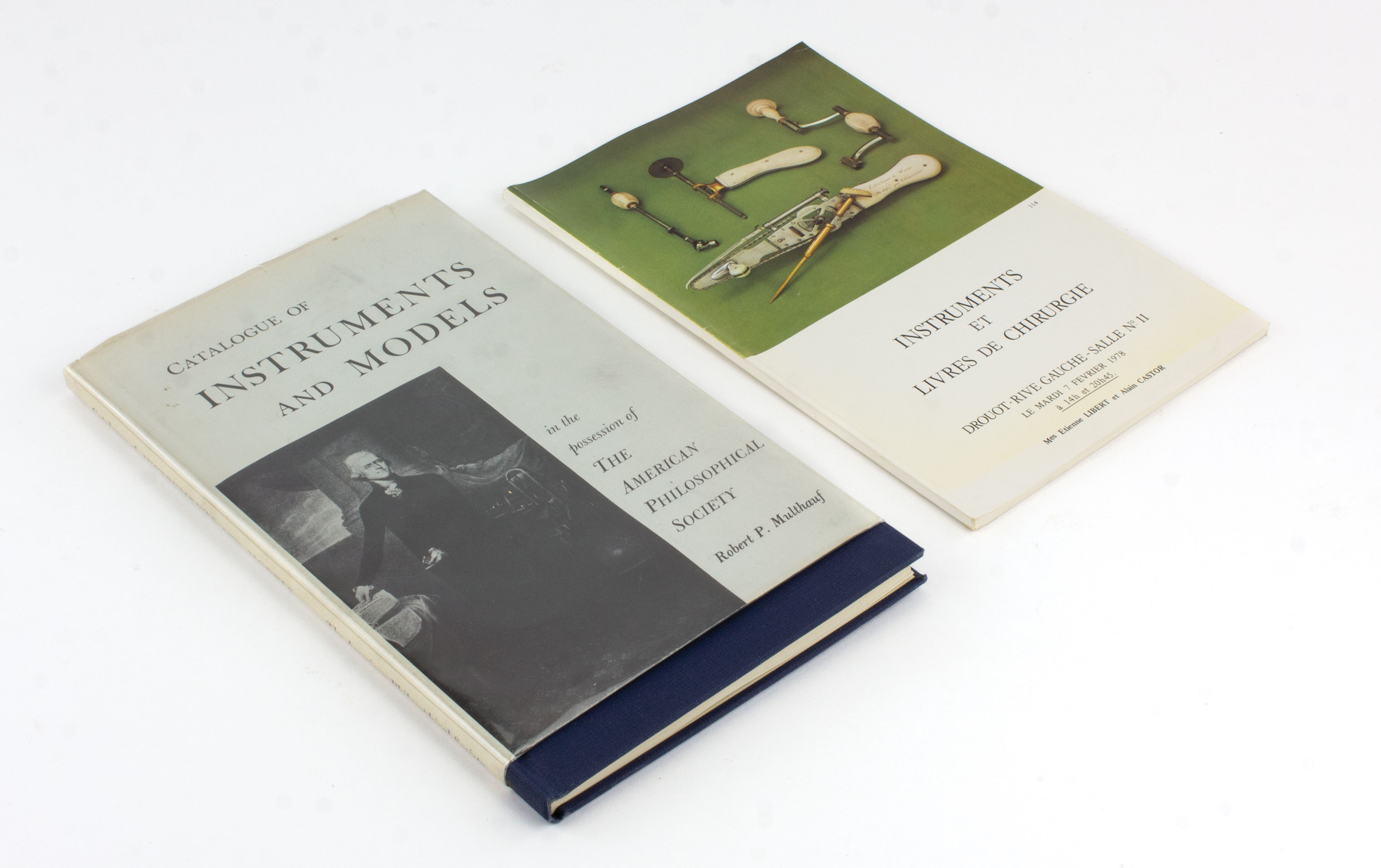 B68-769 LOT OF TWO SCIENTIFIC INSTRUMENT BOOKS. "Instruments and Models in the Possession of the American Philosophical Society," copyright 1961, compiled by Robert P. Multhauf, hardcover with dustjacket, 9-1/2" x 6-1/2", 80 pages with 15 pages of illustrations; and "Instruments et Livres de Chirurgie [Surgical Instruments and Books]," copyright 1978, in French, softcover, 9-12" x 6-1/4", numerous illustrations. Good+ 30-60
