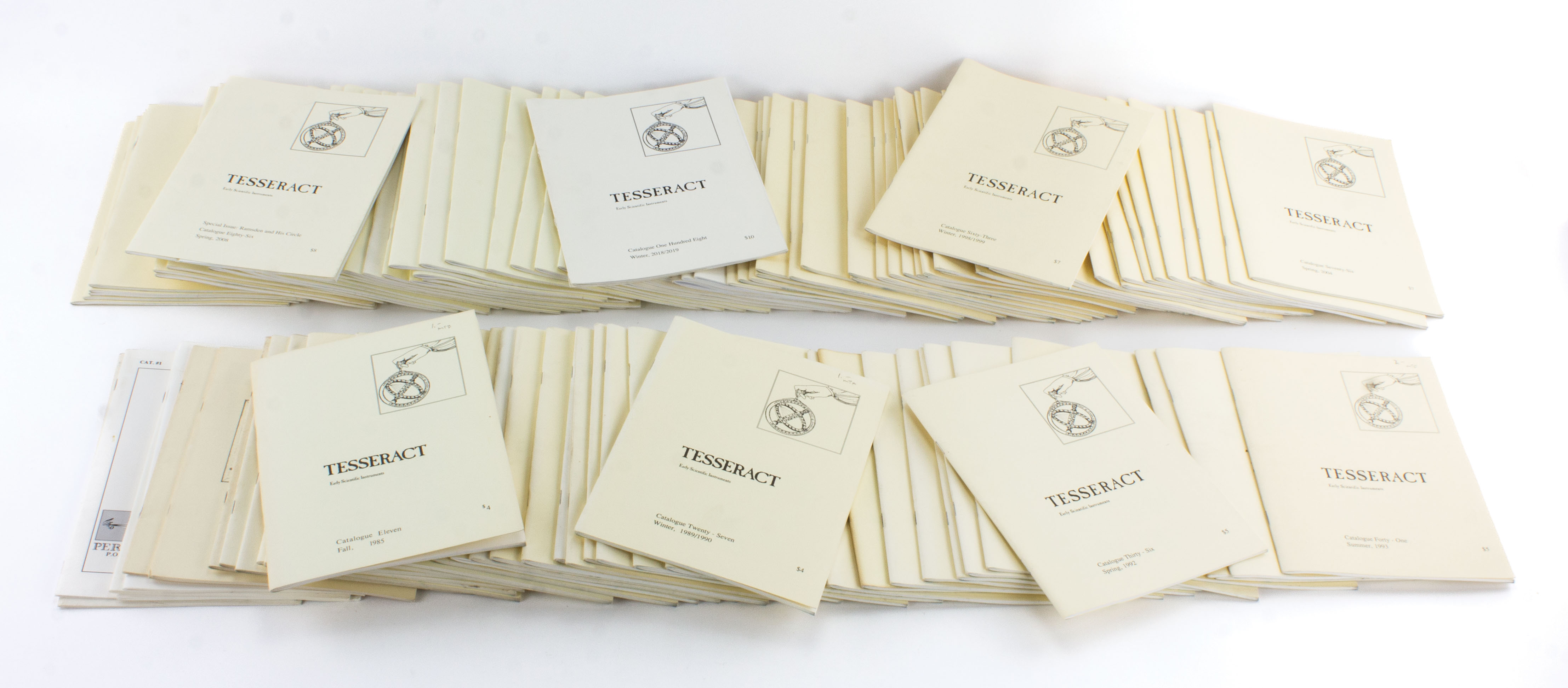 B68-774 SET OF SCIENTIFIC INSTRUMENT CATALOGS. Tesseract. A complete set of David and Yola Coffeen's Tesseract catalogs, 114 total beginning with Catalog A in 1982 and ending with winter 2023/2024. Each is 6-1/2" x 8-1/2", softbound, in near mint condition, with instruments carefully and lovingly described by David. As a bonus, the lot also includes three volumes of Rittenhouse, the Journal of the American Scientific Instrument Enterprise, which was published by the Coffeens, and two issues of Dale Beeks' Perceptions Scientifica catalogs from 1985-87. A treasure trove of information and invaluable reference work. Fine 150-300