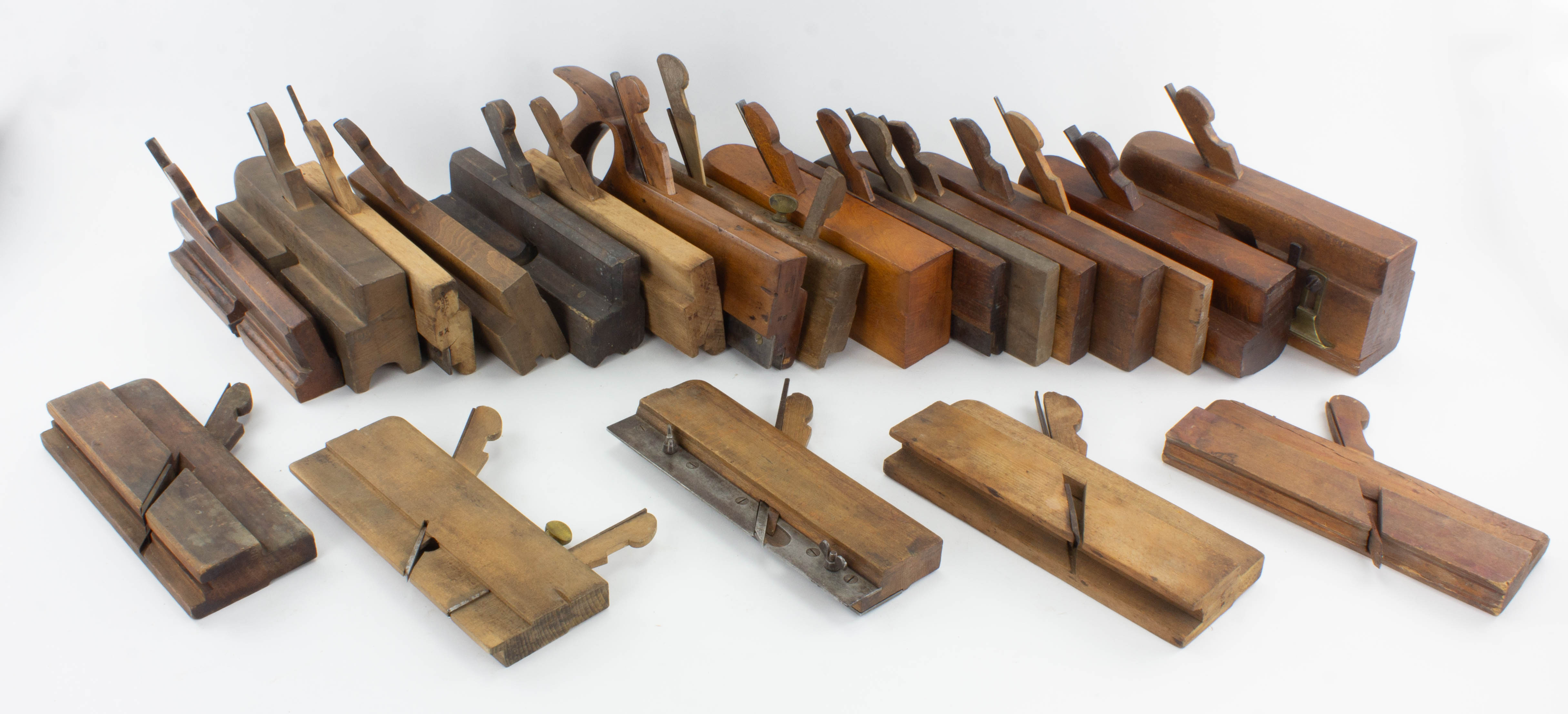 B68-778 DEALER LOT OF WOODEN PLANES. Twenty one total, includes various molding planes, several rabbets, and groove cutters from tongue and groove sets. Various makers, most unmarked. All complete with wedges and cutters. As is, no returns. Good and better 75-150