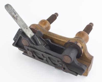 York2024-408. GERMAN PLOW PLANE. Weiss & Sohn. Cast iron body and depth stop, wooden screw-arm fence. Has crack in body near cutter. Unusual. Good- 50-100